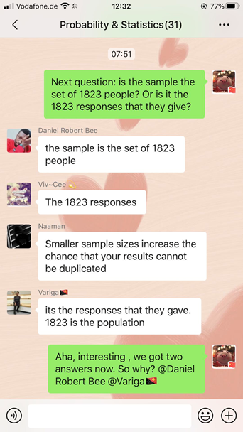 尽管身在不同国度,师生们却仿佛身处同一教室。“我会提前把要发在微信群的图文解说编辑好,节约临时打字和发送图片的时间,更好地把握课堂节奏。”教授《经济数学》的郭丽丽谈到,“即便这样,图文直播也有一定的延时性,导致常常拖堂,但同学们都非常配合,他们的学习热情高涨,课堂互动频繁,学习效果反而更好了!”