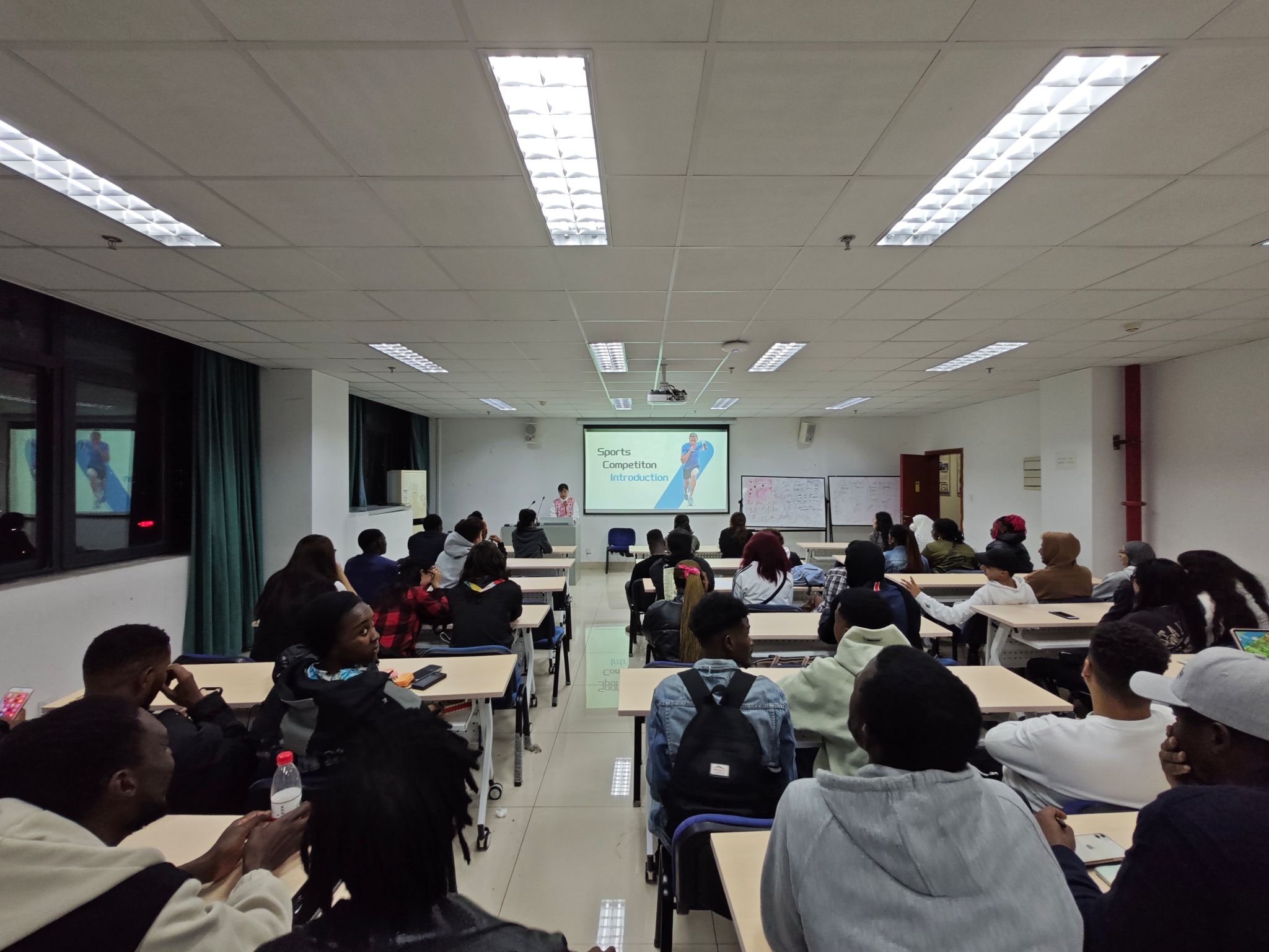 会上,通过幻灯片演示和播放相关运动视频的方式向留学生们介绍了各项比赛的规则和要求。本次新生运动会不仅有跑步、跳高、铅球等个人项目和拔河、接力赛等团队项目,同时还有青出于蓝、袋鼠跳等趣味运动项目。留学生们纷纷报名参加自己感兴趣的项目。