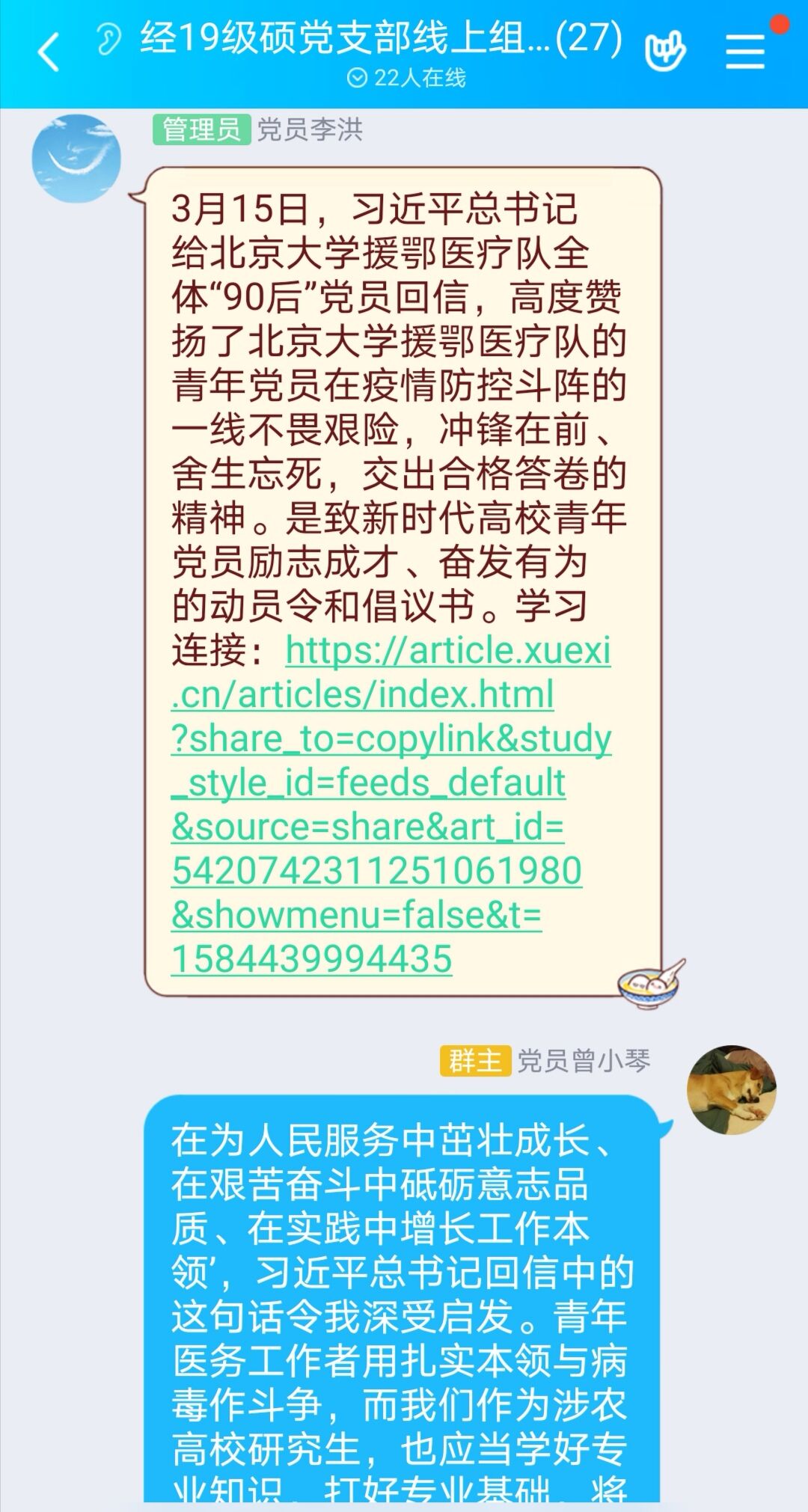 “川农大精神”是学校的宝贵精神财富,也是川农人的精神底色。在“川农大精神”正式提出 20 周年之际,为进一步传承弘扬“川农大精神”,2020年4月28日中午,beat365正版唯一官网2019级硕士研究生党支部在王敏同志主持下,通过QQ群在线召开了“学习川农大精神,争做最美川农人”主题党日活动,支部13名党员和12名入党积极分子参加会议。