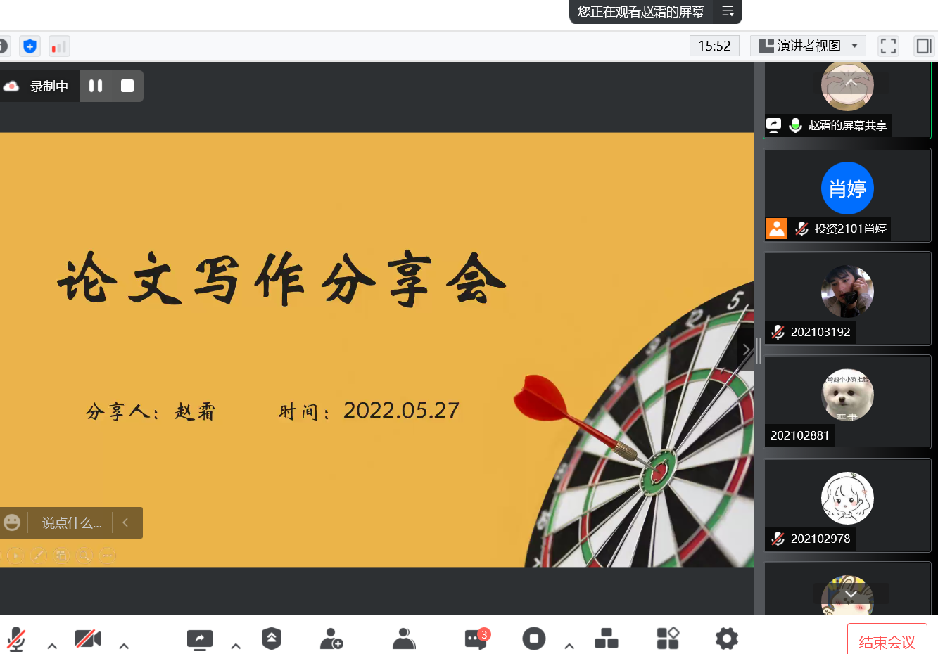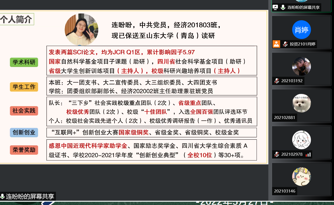 为提升我院学子的学术研究、学术论文写作兴趣,beat365正版唯一官网第二课堂与创新创业服务部于2022年5月27日下午16:30在线上腾讯会议,开展了“三趣汇”分享会——学术论文写作经验分享会,出席本次活动的嘉宾有经济2018级连盼盼,经济2019级宋一鸣,金融2019级闵锐,经济2019级赵霜,嘉宾们来自学院的各专业,有着较为丰富的学术论文写作经验,曾多次在SCI等收录期刊发表论文。