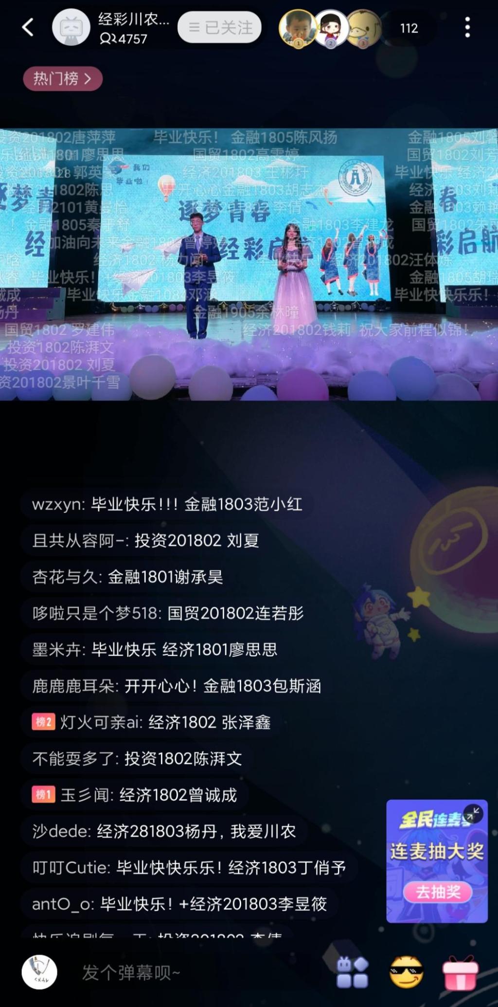 6月6日,我院“逐梦青春,经彩启航”--2022届毕业生晚会成功举办。出于疫情防控考虑,本次毕业晚会采取线下表演和线上录屏相结合的展现形式,控制现场人数在50人以内,毕业班同学则以班级为单位在教室组织观看现场直播。