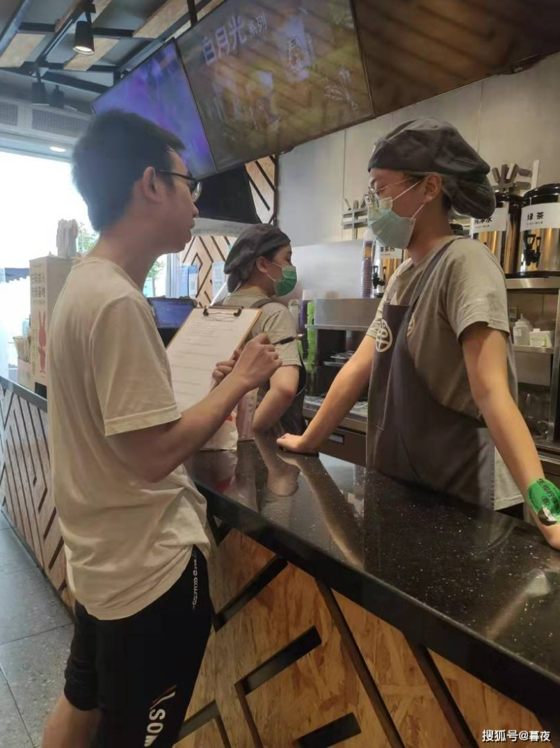 图为“外卖绿色联盟”成员在成都市温江区学府路新尚天地对大学生普遍喜欢的茶饮类外卖商家进行调研