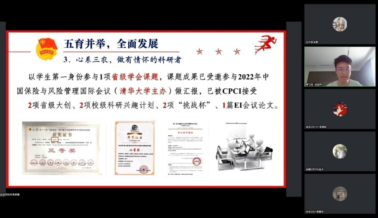汲取榜样力量,投身三农实践。会议伊始,与会团员齐唱团歌、进行集体青年大学习,随即由第九期校青马班学员胡语梣带来《新时代的伟大成就》主题微团课分享,他先是立足于自身实践,发挥榜样模范作用,提出大学生应服务同学、奉献集体;五育并举、全面发展。紧接着援引川农大116年风云历史,一代人有一代人的使命,新农人、亦是兴农人。他号召与会青年,要在学习生活中深入贯彻习近平总书记四川考察期间做出的重要指示,铭记学经强农使命,成为“大有可为”的内在动力,为推进乡村全面振兴不断作出更新、更大的贡献。此外,活动还邀请优秀社会实践团队队长刘静怡同学进一步向团员们传授社会实践调研经验,发出积极参加社会实践活动的有力号召,鼓励团员们在社会大舞台中贡献青春力量。
