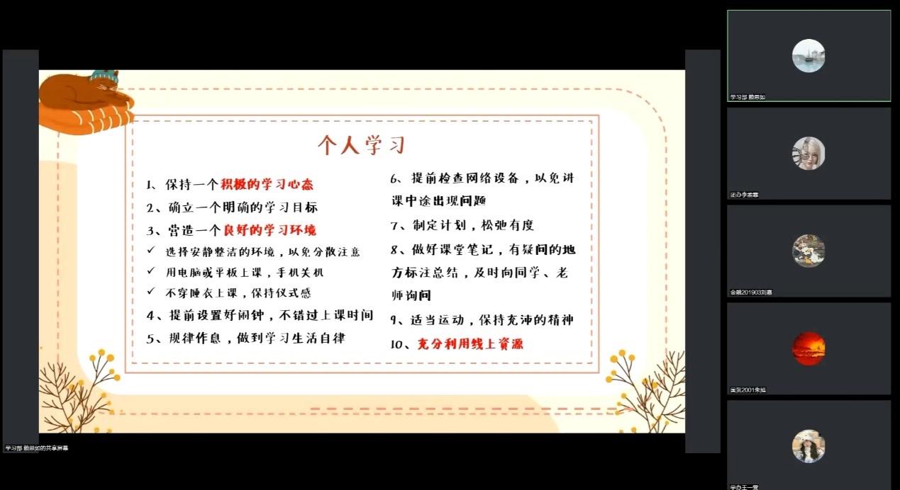 遵守防疫政策,做好线上学习。我院学生会团支部向团员们介绍了疫情防控相关政策以及校内外的防疫要求,并从学习心态、学习计划、学习环境等多个方面进行了线上学习经验的分享。各位团员青年也纷纷表示将坚定支持防疫政策,认真对待线上学习,依据上述分享进一步保证自己线上学习的效果。