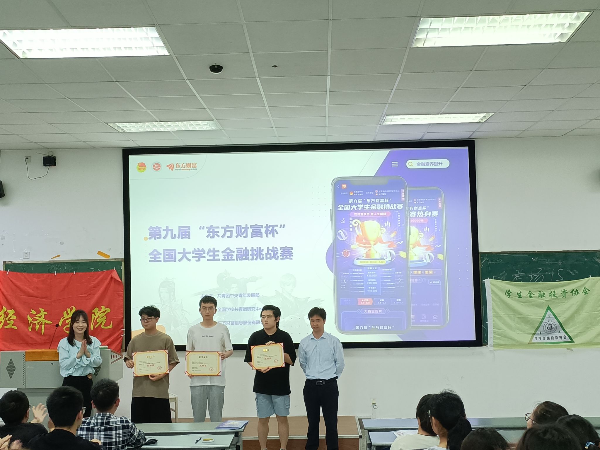 张帮正老师介绍了我校去年参加“第八届‘东方财富杯’全国大学生金融挑战赛”的具体情况,并与东方财富尚尉老师为获得“第八届‘东方财富杯’全国大学生金融挑战赛”国赛三等奖的三支队伍颁布了荣誉证书。张老师鼓励同学们今年再接再厉、通过实践锻炼、不断提升综合素养。