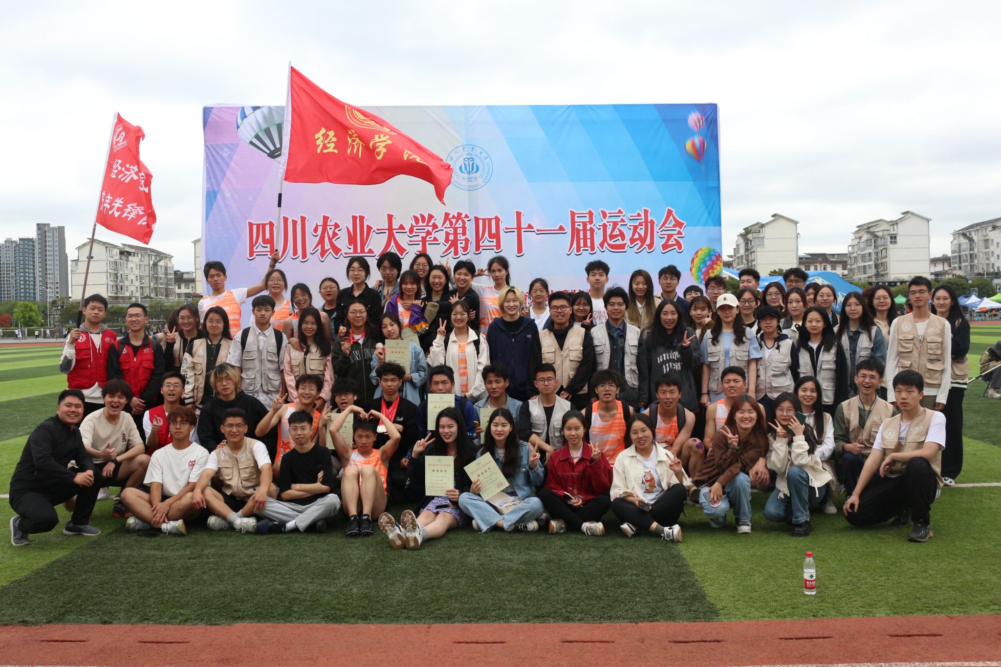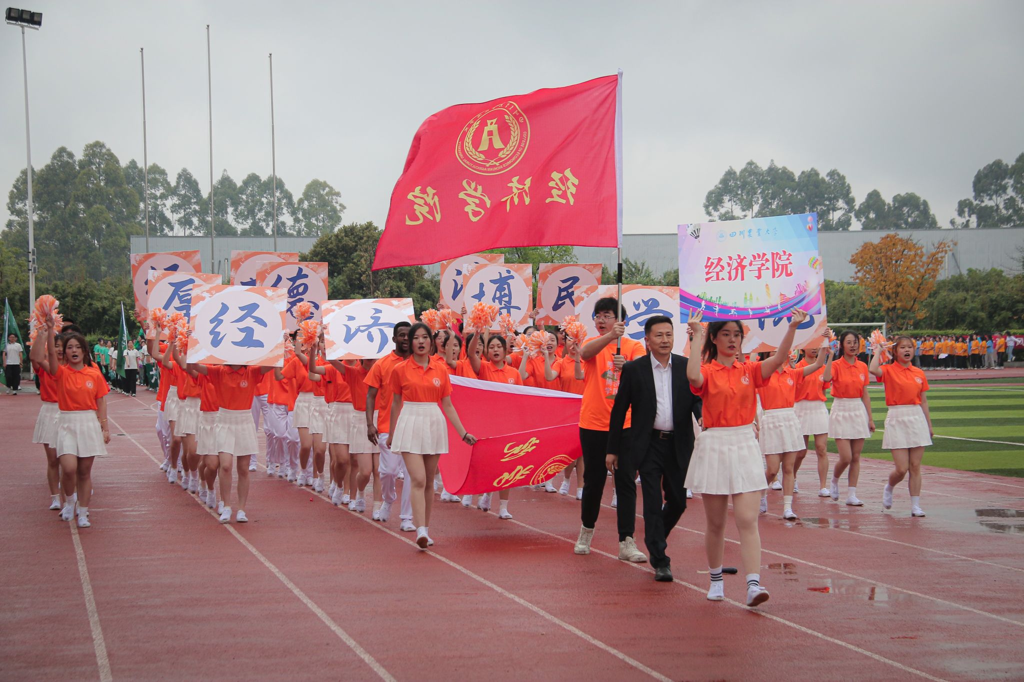 2023年4月21日我校第四十一届校运会隆重举行,我院院长蒋远胜教授出席开幕式、副院长吴平教授带领入场式队伍亮相开幕式,党委办公室主任兼团委书记钟贝老师、党委办公室副主任兼团委副书记朱玉老师、党委办公室罗利娟老师、党委办公室武方琨老师带领我院运动健儿、后勤组、医疗组和宣传组人员积极投身校运会。轻抚凉爽的春风,呈递火热的激情,我院健儿们在多个项目奋力拼搏、大展风采。经过两天的激烈角逐,我院最终以241分的总成绩位列成都校区第4名。