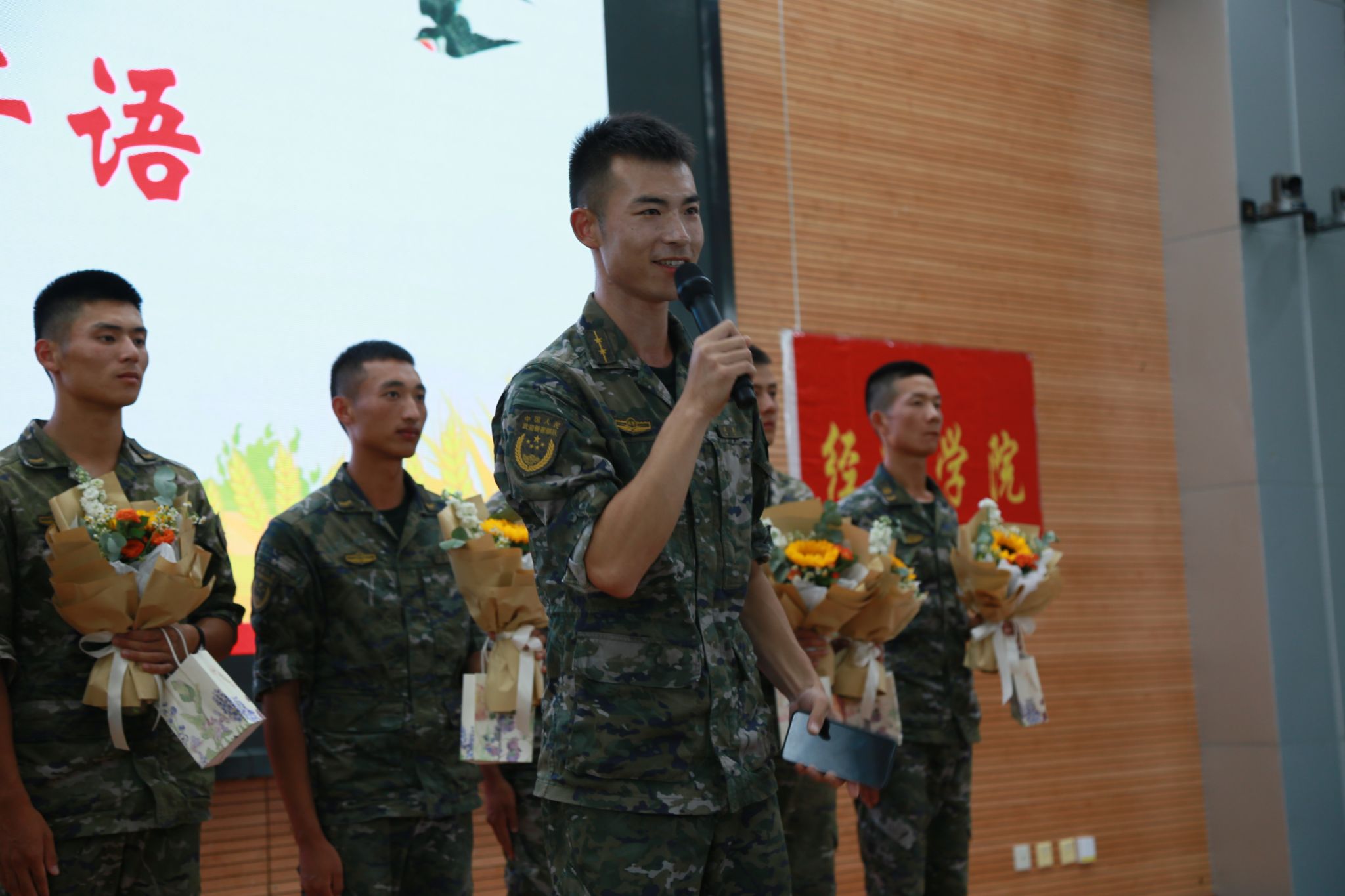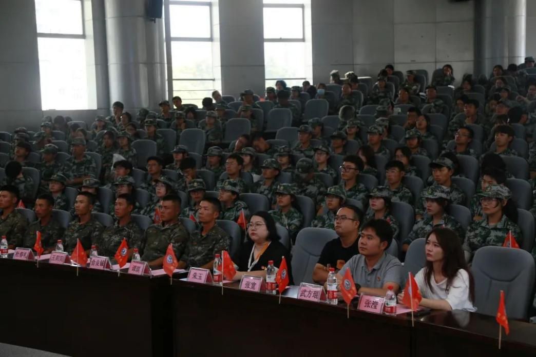 经联202301班的刘瑞松同学说到:“我们可亲可敬的谭队长,他曾经在科创中心给我们上大课时调侃自己说自己是篮球场上的‘闲人’,但我们都知道,不论风雨烈日,他一直在操场监督指导我们训练,一直在用心观察,仔细思考如何让我们的训练更加高效。我们都相信,在您和各位教官的带领下、在我们所有同学的努力下,最后的汇报表演一定能取得圆满成功!”投资202301班的翁莞林说到:“敬爱的教官们,我们不仅要感谢你们这十余天军训生活的陪伴,更要感谢您让我们学会了坚持,变得更加坚强。在今后的大学生活里,我们将牢记你们的嘱托,不断前进!”谭琪中尉在演讲中说到:“军训作为我们上大学的第一课,是一个特殊的成人礼。很多同学想问我军训的意义是什么,在我看来,军训的过程不在于你学会了多少军事技能、磨练了多少军事动作。军训最大的意义在于‘磨练与坚持、刻苦与毅力’。它教会在你遇见苦难时依旧不放弃的‘坚守’,教会你与同伴共同完成困难任务时的‘团结’。愿每位同学在本次军训中都有所收获,希望军训教会你们的这些精神能激励大家在未来的日子里坚持到底、永不言弃!” 活动中每一位同学和老师的演讲都能激起此起彼伏的掌声。最后学员代表为陪伴他们走过炎炎烈日或风雨交加的十余天的教官们,献上最清新的花束与祝福,表达最真挚的感谢。