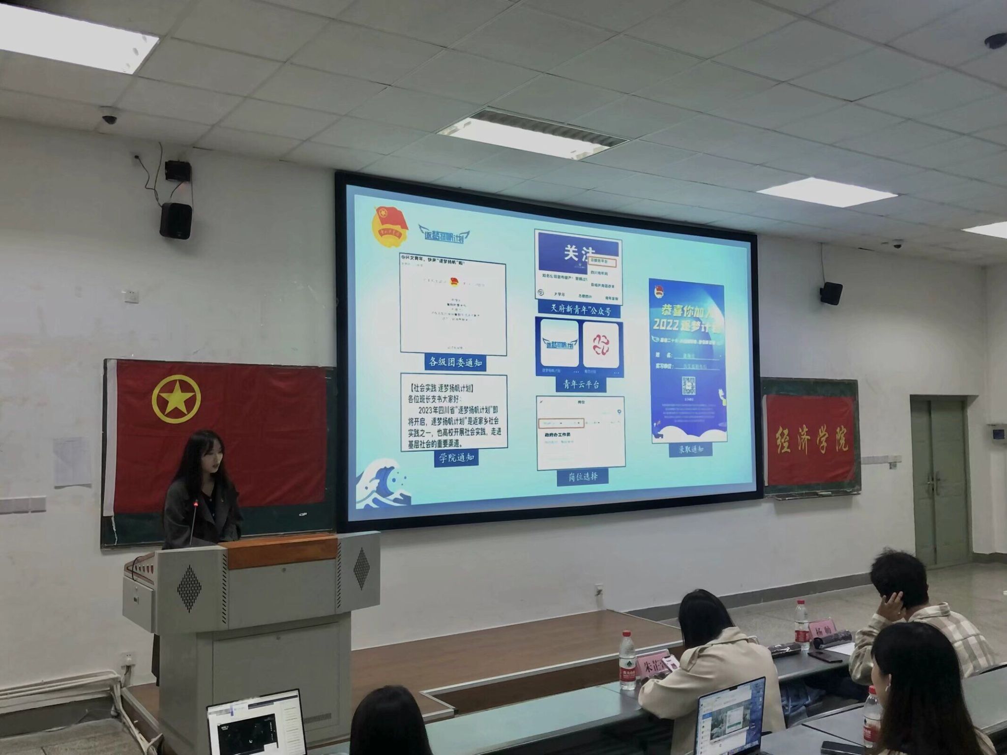 朱芷萱同学从“青春正好 逐梦前行”为主题,分享了她在暑期参与“逐梦扬帆计划”基层实习的过程与感悟。从信息的获取,到简历的制作,再到实习的收获,朱芷萱同学为我们深入浅出地讲解了“逐梦计划”的流程与经验,鼓励在场的同学们积极参与简历制作大赛等相关比赛,不断丰富自己。最后,她表示自己在实践中体会到了实践的收获大于付出,她呼吁同学们关注时代、关注社会,找到适合自己的实践方向,明确实践目标,鼓励大家要勇敢迈出参与社会实践的第一步,用实际行动在祖国最需要的地方淬炼青春、茁壮成长。