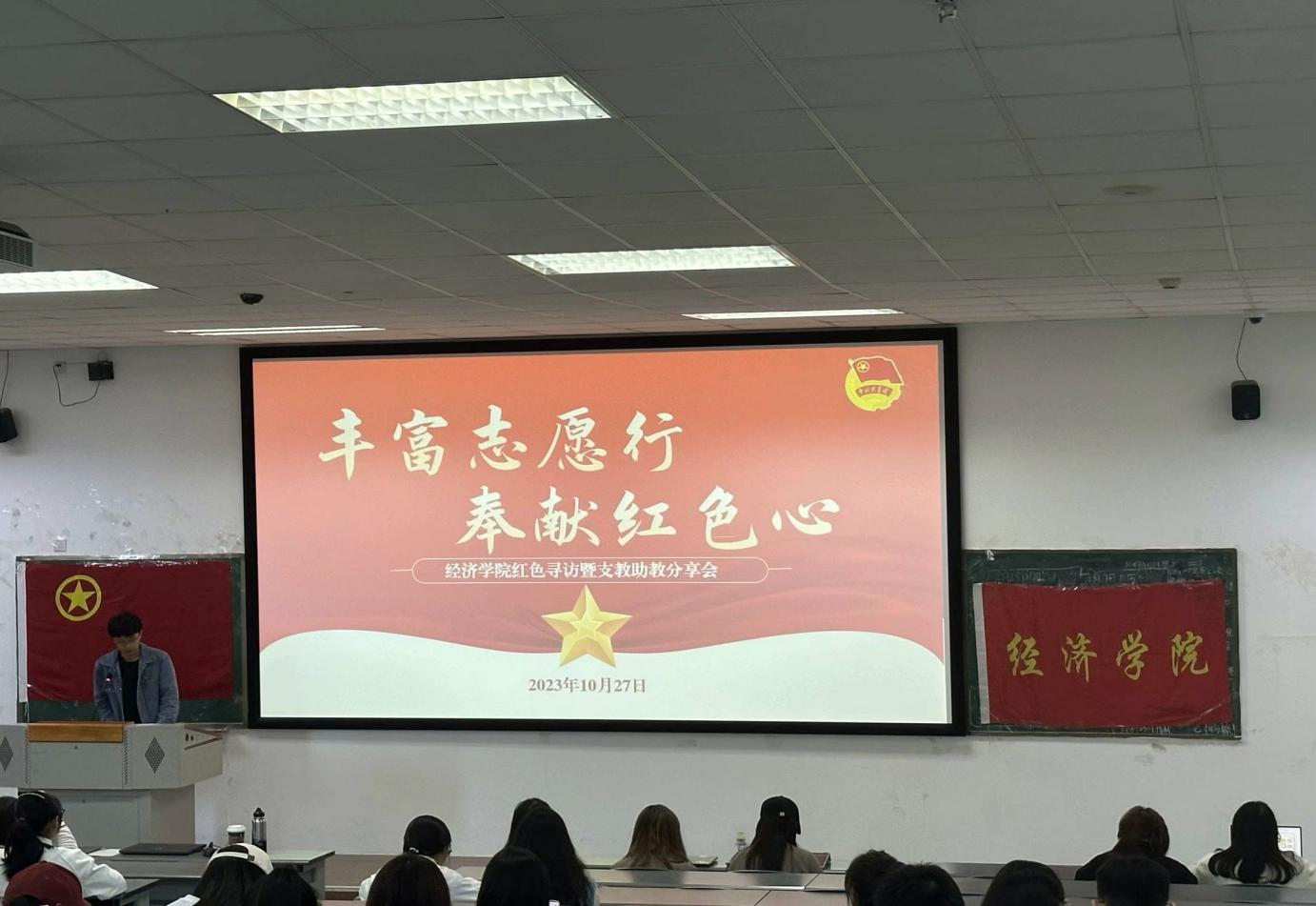 为了进⼀步推进社会实践“双百⼯程”,总结社会实践成果,营造出良好参与社会实践氛围,提⾼我院社会实践的参与率和参与质量。beat365正版唯一官网团委实践部于10月27日在4-A208开展了以“红色足迹寻访暨支教助教”为主题的社会实践分享会。本次宣讲会邀请到了校学生第二课堂成绩单运营中心负责人胡理奥、beat365正版唯一官网第九届学生团体联合会主席团成员张予萌以及“经”彩童心·春泽支教队队长李承昊。