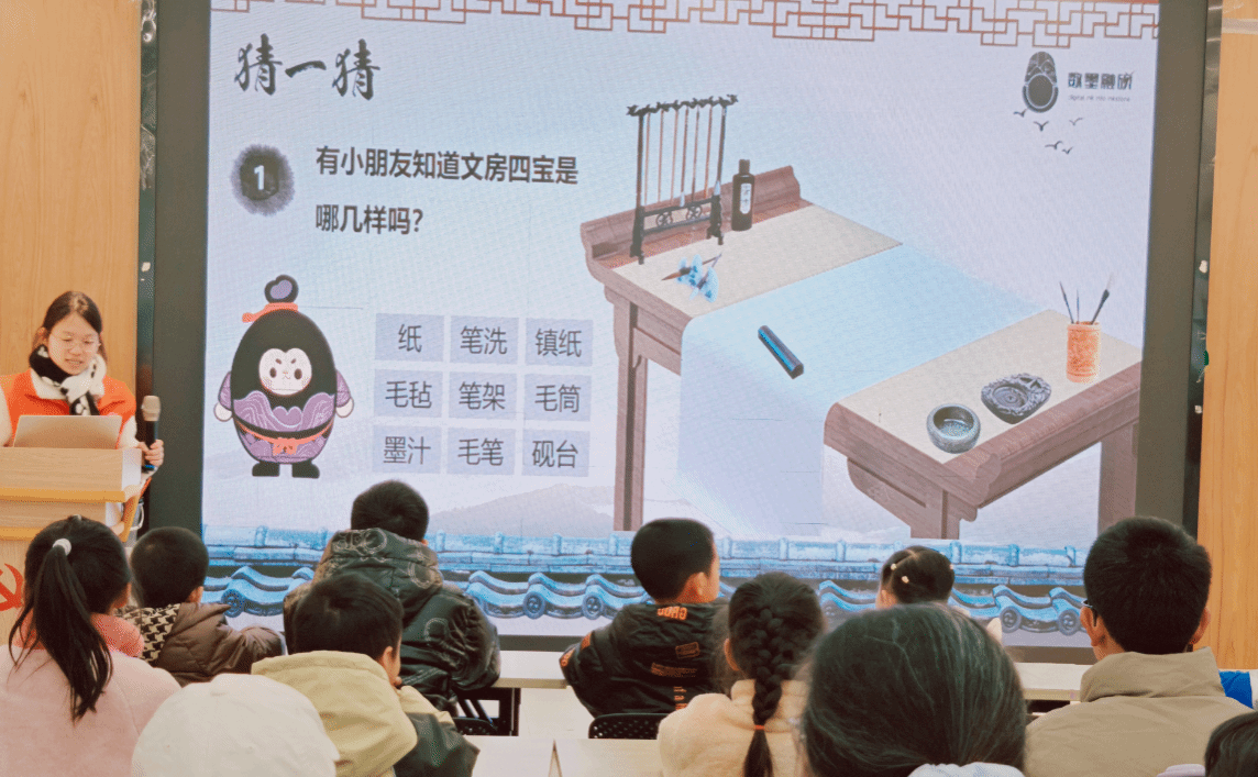 团队还设置了趣味有奖问答与作品展示分享环节。从峡砚的实用功能延伸到相关的书法水墨知识,孩子们争相举手,回答准确而充满童趣,不仅巩固了知识,也展现了对传统文化的认同感。