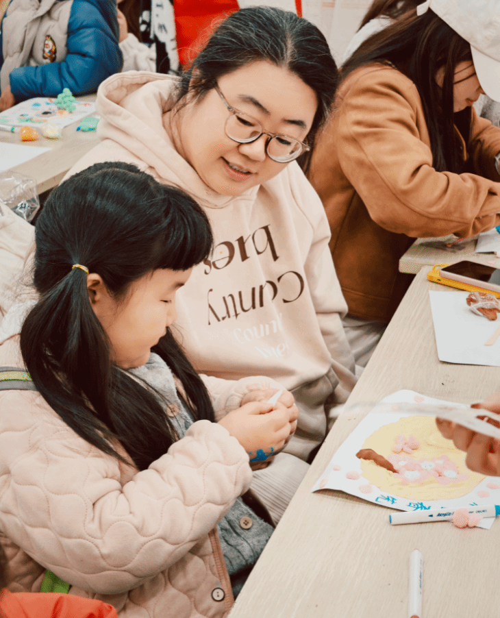 实践环节是本次活动的亮点。团队突破传统非遗体验“只观不做”或材料门槛高的限制,创造性引入超轻黏土作为替代材料。在团队成员与社区志愿者的引导下,孩子与家长一起开启“创砚”之旅。孩子们是创作主力,家长们则是协助者与共同学习者。他们的创作既有对传统“抄手砚”“随形砚”造型的认真模仿,也有天马行空的个性创造,不少家庭创作出融合生肖卡通、自然意象或抽象线条的“新派”砚台。