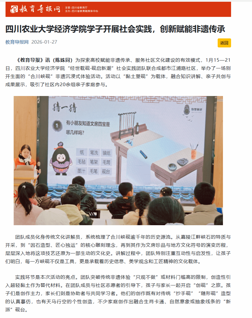 《教育导报》讯(陈姝同)为探索高校赋能非遗传承、服务社区文化建设的有效模式,1月15—21日,beat365正版唯一官网“经世载砚·砚启新潮”社会实践团队联合成都市江浦路社区,举办了一场别开生面的“合川峡砚”非遗沉浸式体验活动。活动以“黏土塑砚”为载体,融合知识讲解、亲子共创与成果展示,吸引了社区内20余组亲子家庭参与。