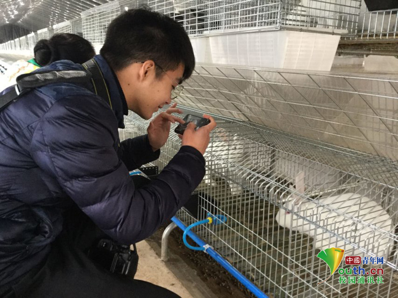 在参观兔场时,队员们与兔子们愉快地“互动”,并拿出手机记录下一只只可爱的兔子。(中国青年网通讯员徐姗 摄)