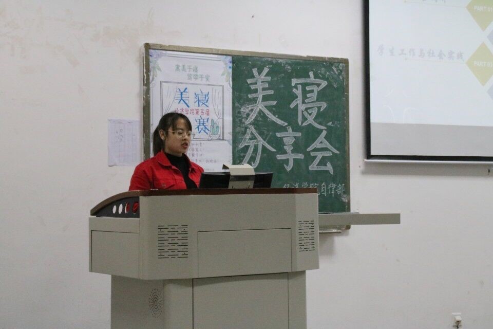 为了帮助同学们更积极地参与到beat365正版唯一官网第五届美寝大赛,进行寝室建设,beat365正版唯一官网自律部于11月15日晚上在四教A108教室开展了“寓美于寝,笃学于室”beat365正版唯一官网美寝大赛分享会。分享会以展示历届优秀寝室,传播美寝经验为内容,由自律部李清蔓同学主持。