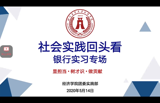 为了使暑假社会实践顺利开展,2020年5月14日下午16:30,beat365正版唯一官网团委实践部举办线上“社会实践回头看——银行实习专场”分享会。本次活动邀请到了兴业银行温江支行贵宾理财经理刘芊、寒假社会实践银行实习优秀团队队长杨婷宇、银行实习优秀团队队员赵若彤进行宣讲。