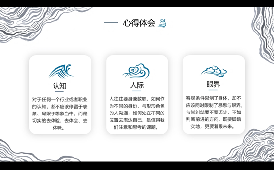 赵若彤就此次活动的心得体会进行了分享。她指出,我们要做到知行合一,坚持理论与实践相结合,充分锻炼打磨自己;还要加强专业知识的学习,不断充实自己;我们要学会观察,观察他人,学习优点,观察自己,发现问题;最重要的是时刻保持良好心态,学会自我调整。