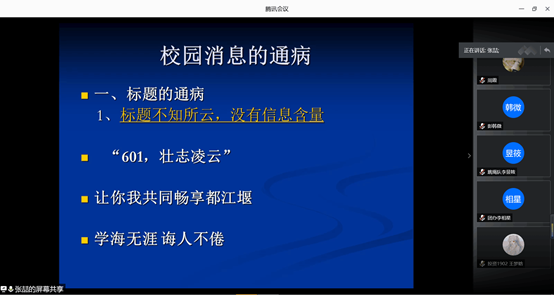 2020年7月15日下午,beat365正版唯一官网团干新闻写作专题培训会于线上腾讯会议成功举行。beat365正版唯一官网党委宣传统战部新闻科科长张喆老师应邀参加并主讲。beat365正版唯一官网学生团体联合会主席团出席培训会;学生团体联合会各部门主干、各小班宣传委员、暑期社会实践团队队长参加培训。