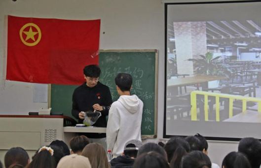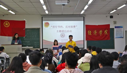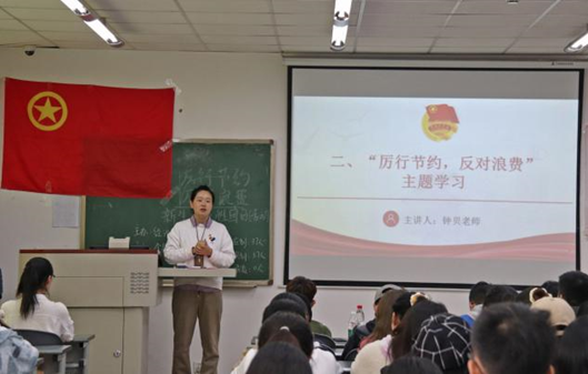 活动开始,在场成员全体起立,齐唱团歌。接下来,学院团委书记钟贝老师分别从资源环境、历史渊源、国家局势三个方面对习近平总书记关于制止餐饮浪费行为的重要指示精神作了深入解读,带领同学们了解厉行节俭、勤俭节约的重要性。