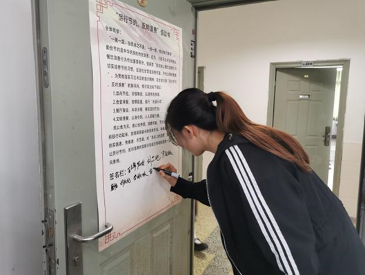 (金融201902团支部成员在“厉行节约,反对浪费”倡议书上签名承诺)