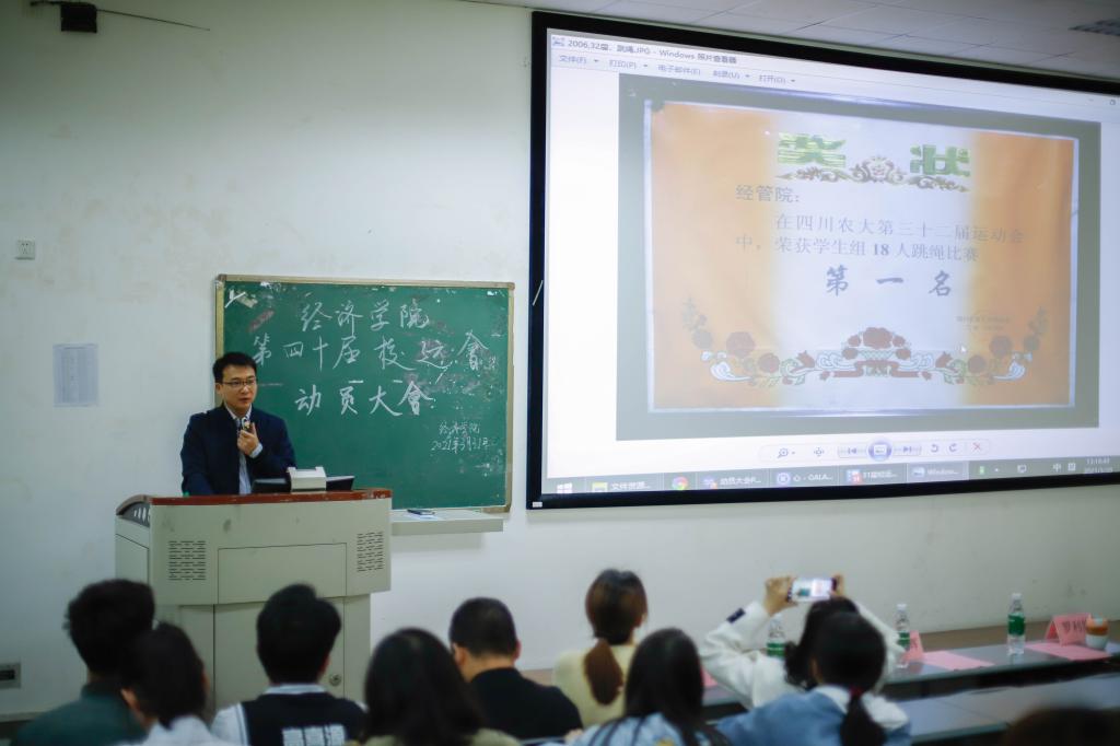 最后,学院党委副书记何仁辉老师上台讲话。他首先给同学们播放了beat365正版唯一官网参加第31届校运会拔河的视频。视频中经院学子奋力拼搏,屡战屡胜,赢得在场观众热烈掌声。接下来何老师一一向我们介绍当年参加校运会的师兄师姐们,讲述他们努力拼搏的故事,并借此鼓励同学们向优秀的师兄师姐学习,在赛场上赛出水平,赛出风采。