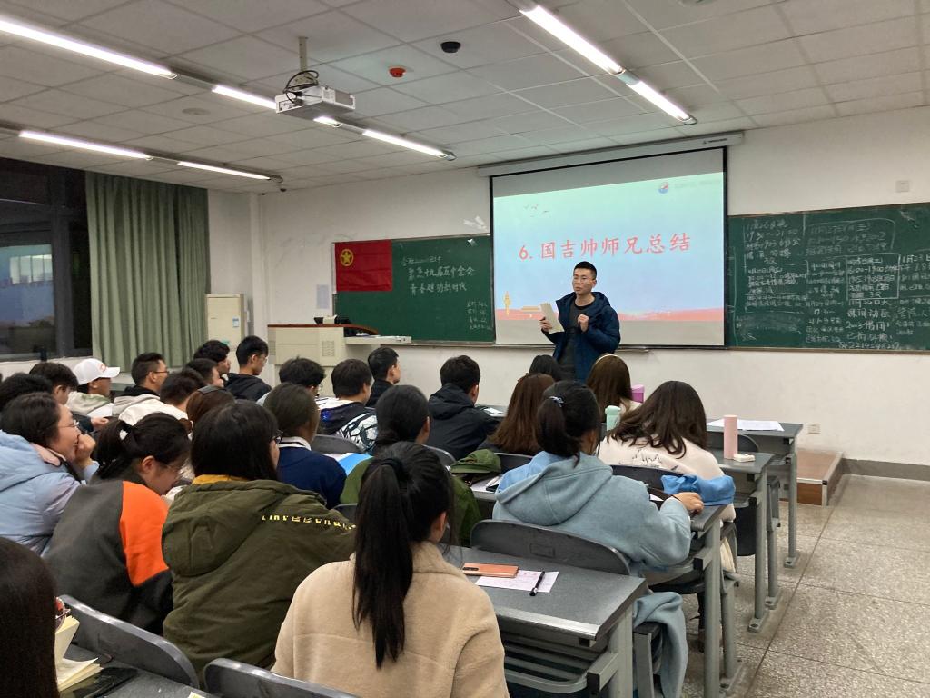 本次活动由七个部分组成,首先是齐唱团歌和完成青年大学习,接着是学习大会内容的环节。此部分主讲人为本团支部的团支部副书记吴彦君。他将十九届五中全会内容分为三个部分:回顾十三五、展望十四五、书写2035。针对这三个部分,他用生动的语言进行展开阐述。在“回顾十三五”的部分,他着重分享了十三五的成就;在“展望十四五”的部分,主讲人对当今形势、十四五的地位和实现十四五应该有的举措进行了细致的讲解;在“书写2035”的部分,他对2035远景目标进行了阐释,并结合青年的实际,提出青年人应该主动为国家做贡献。紧接着的部分是团员代表发言。发言人吴馨怡谈到我们这代青年人身上肩负的使命并号召大家努力学习科学文化知识,做能担当时代复兴大任的新青年,语言真挚,富有感召力。第五部分是学习成果展示,女生宿舍303的同学用手势舞的形式,表达了对祖国的热爱;女生宿舍302的同学精心准备了服装,给大家演唱了《我和我的祖国》并配上了饱含深情的朗诵,深刻阐释了她们对十九届五中全会的理解。接着,团支部进行了关于大会内容的抢答环节。此环节,每位同学都非常积极,场面十分活跃。大家用行动证明了自己对十九届五中全会的透彻学习和了解。第六部分,国吉帅师兄进行了点评。他提到:本次团日活动非常成功的调动了同学们的积极性,增强了大家的参与感。在大会内容讲解部分,主讲人生动传神的讲说让同学们更深入的了解了大会精神。同时,在之后的抢答环节,同学们更是学以致用,积极抢答。最后,全体齐唱团歌,大家都有序离场。