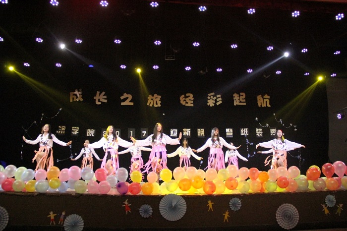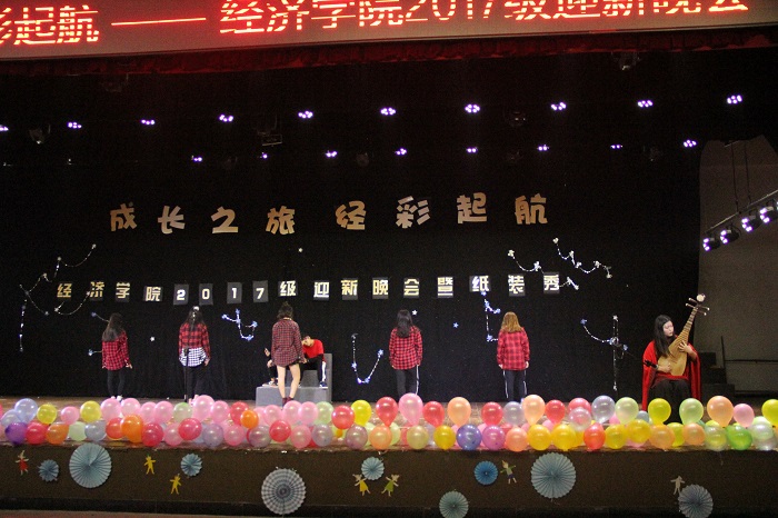 晚会分为《纯真年代》、《青涩蜕变》、《宁静致远》和《坚定信念》四个篇章,新老生以纸装秀比赛为载体同台献技,通过歌舞、小品、话剧、走秀、器乐等多种艺术形式表达着对成长之旅的美好憧憬和对新生入校的热烈欢迎。学院院长蒋远胜的欢迎辞情真意切,指明了大学四年成长成才的方向,表达了对新同学的殷切期望;话剧《地铁故事》以幽默的演绎批判了地铁里的不文明想象,弘扬了社会主义核心价值观中的公民基本道德规范;情景剧和诗朗诵《歌颂党恩》再现了中国共产党从嘉兴南湖的一艘小船出发到掌舵中国巨轮所历经的苦难与辉煌,表达了同学对十九大胜利召开的喜悦之情。鲜艳党旗引领成长之路,嘹亮歌声唱响青春旋律,多彩纸装秀出经济风采。