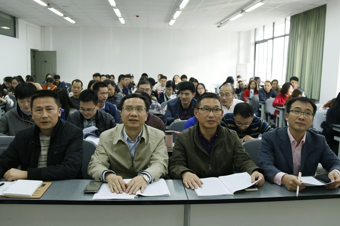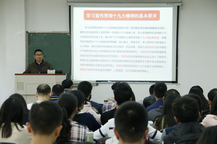 会上,漆雁斌作专题辅导,详细地介绍了党的十九大报告的主要内容。他从准确把握实现中华民族伟大复兴的历史使命与“四个伟大”、明确习近平新时代中国特色社会主义思想八个要点、深刻领会习近平新时代中国特色社会主义发展的十四条基本方略,以及40个新提法新举措等方面,对十九大精神做了深入、系统的解读。他指出,学院党委将加强组织领导,精心实施,按照“5个聚焦”要求全面深入地用十九大精神武装师生头脑、指导实践,深入推动“两学一做”常态化制度化,不断加强和改进思想政治教育工作,以十九大精神为引领切实做好学院教书育人、学科科研和助推脱贫攻坚等各项工作的统筹谋划部署。