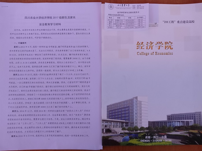 学院热情周到的接待让家长们放心地把新生交给了志愿者们,专心致志地阅读着《学生及家长安全教育学习材料》中的诈骗、意外伤害等真实案例和安全提醒。