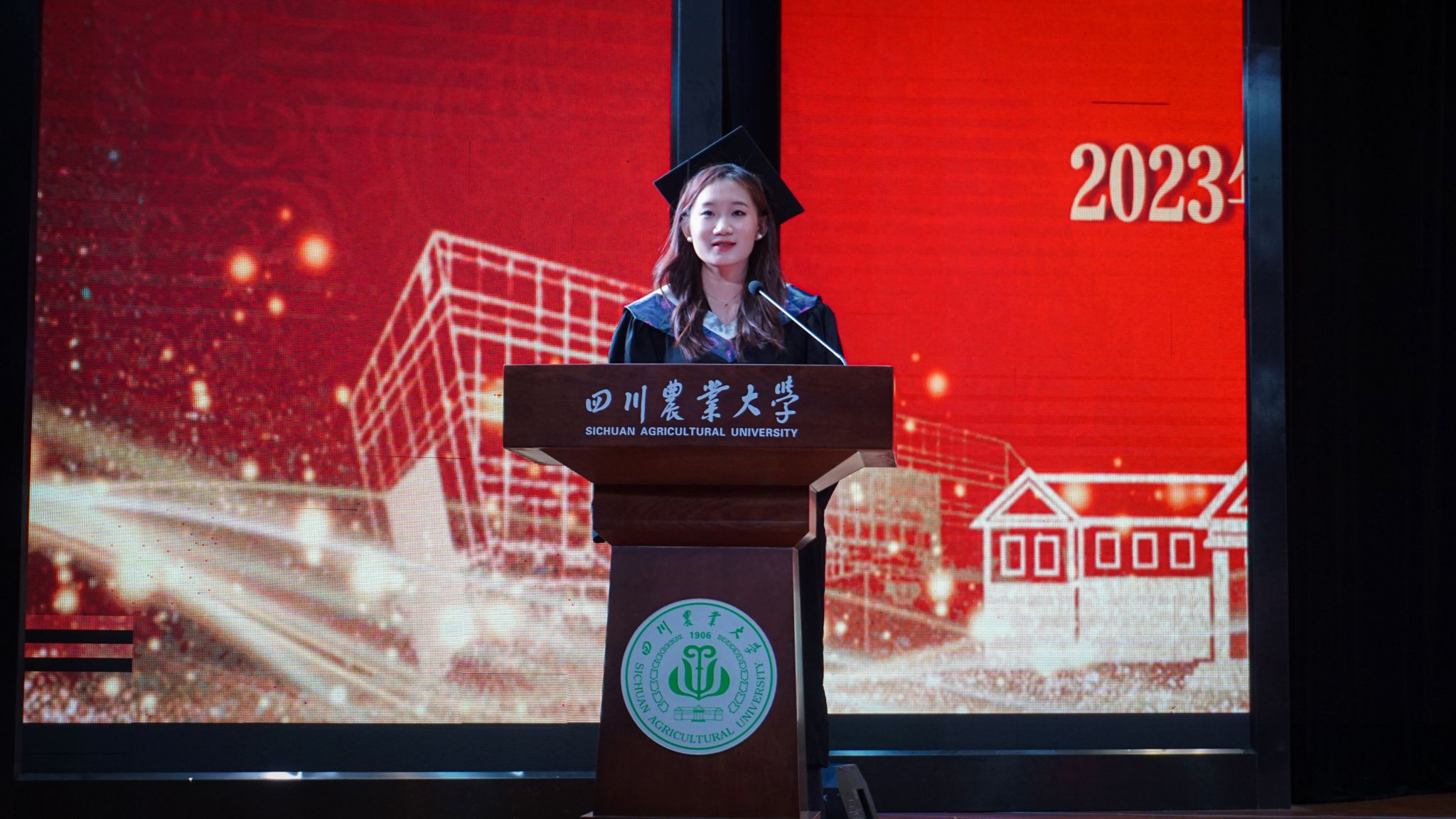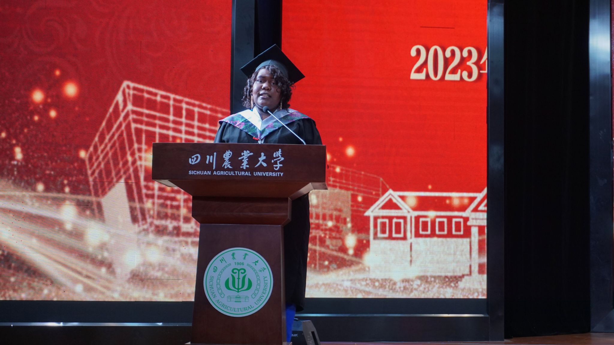 来自学院首届国际经济与贸易全英文专业毕业生代表Chibisa Vivienne Vimbai对学校全体老师、工作人员表达了诚挚的谢意,向2023届毕业生表示祝贺,分享了自己过去4年里在川农的美好时光,最后,她真诚地说:“艰难的情况会铸就更强大的自我,挑战将继续成为我们生活的一部分。希望你们能找准自己的位置,面对现实并创造自己的精彩人生!”