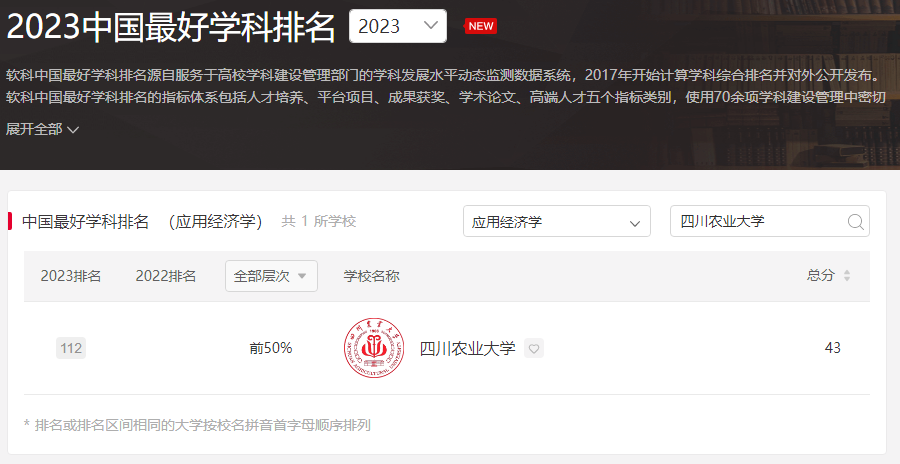 根据最新发布的2023软科中国最好学科排名,我院“应用经济学”学科首次上榜,排名112位,进入排名前50%,在农林高校中排名第4。