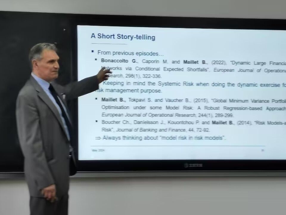 5月28日-29日,beat365正版唯一官网、学校德国研究中心邀请意大利威尼斯大学beat365正版唯一官网Bertrand Maillet教授到访。5月28日下午,Maillet教授在我院开展题为“A Dynamic Multi-strategy using a Constrained Sparse Penalized Regression Analysis of Combinations of Notorious Portfolios with Reinforcement Learning”的学术讲座。讲座中,Maillet教授介绍了一种新型的通过不同市场条件检验有效的动态多策略资产配置方法,该方法基于约束稀疏惩罚回归,并利用强化学习技术,以适应市场变化,增强基金的长期绩效。我院与会中外学生就该方法的具体实施、潜在风险等问题提出自己的疑问和见解,开展了热烈的讨论。