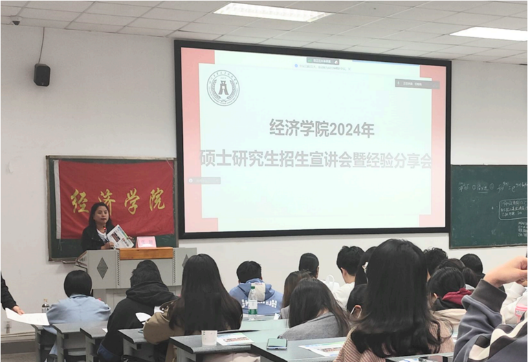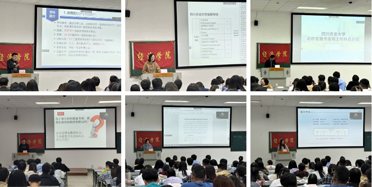 郑勇、宋坤、张帮正分别介绍了应用经济学一级硕士学科点、金融硕士(专硕)学科点、农村发展(专硕)学科点的专业定位、培养模式、科研成果、师资队伍、报考要求等具体情况,围绕“办学体系完善”、“教学条件完备”、“科研条件良好”等优势进行了重点宣讲,展示了学科高层次应用人才培养方案同乡村振兴战略人才需求的无缝衔接,突出展现了学院良好的科研、实习和就业条件。