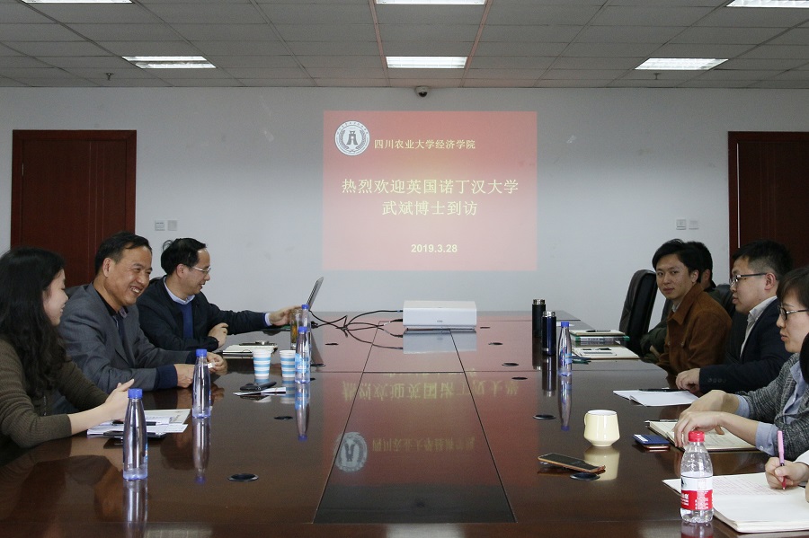 3月28日下午,英国诺丁汉大学(University of Nottingham)商学院创新创业中心高级研究员、诺丁汉大学中国研究中心协调员武斌博士来访我校,beat365正版唯一官网院长蒋远胜教授、国际交流合作处副处长陈庆及李后建副教授等研究农村农民农业方面的专家学者参加会谈。