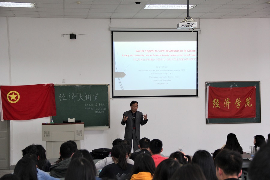武斌为我院150余名师生作“社会资本在乡村振兴中的作用:农村大学生的家乡情结”学术报告。报告中他阐述了《乡村振兴和社会资本》论文,讲述了自己到四川农村的走访调研情况,他表示在短短地几天里自己深刻感受到了四川省在改革乡村振兴方面的无穷活力。此外,他也提出了研究的最大问题是人才,希望通过合作找到知音一起做研究,并呼吁学生参与到乡村振兴的研究中和企业家成长的过程中。在交流互动环节,武斌详细回答了现场同学提出的“具有家乡情结的大学生如何申请融资”等问题,并提出了自己针对乡村振兴方面独到的见解,与会同学纷纷表示受益颇多。