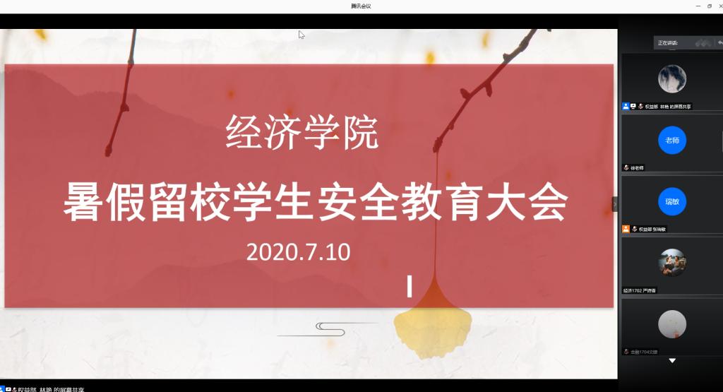 7月10日,为帮助暑假留校同学了解留校管理安排,切实落实学校防疫防控管理要求,beat365正版唯一官网面向学院全体2020年暑假留校学生召开了线上暑假留校安全教育大会。学院辅导员老师以及学生会权益部就暑假留校安全问题及留校管理工作对暑假留校学生开展了专题教育。