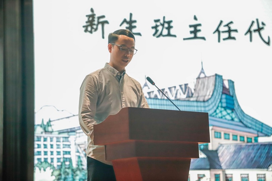 教师代表、经济学202002班班主任邓鑫老师发表讲话。邓鑫老师曾是经济学本科2011级2班的一位同学。川农九载的求学经历使他完成了从学生到老师的角色转换,但不变的是对学弟学妹们的关爱。作为学院的“大师兄”,他与同学们分享了一些自己的大学感悟:首先是努力学习,其次是在学有余力的同时不断提升自己的综合素质能力,第三,要成为一个严于律己、宽以待人的可爱的双标人。“玩命地学,疯狂地跑,茁壮成长”是他对同学们未来四年的深深祝愿。