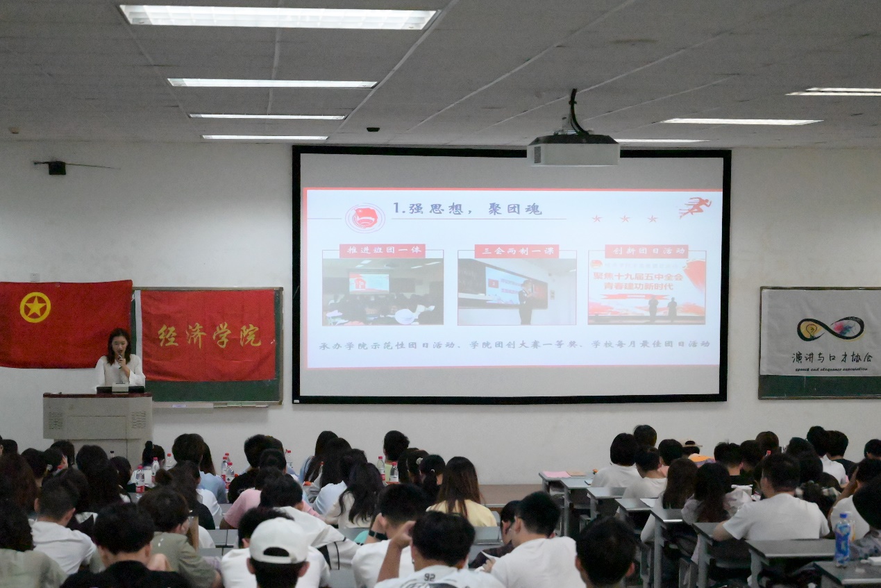 学校十佳团支部书记、国贸201902团支部书记唐晓臻在团旗下分享榜样事迹,从竞选失败到成为团支部“领头羊”,从支部氛围低迷到斩获五四红旗团支部,回顾过去的点滴积累,她不禁感慨道:“作为团支部书记,更要肩负责任,带领支部成员听党话,跟党走,坚定理想信念,在人民需要的地方书写华章,乘新时代东风,在祖国的万里长空翱翔!”学院团委负责人解读了习近平总书记在清华大学考察时发表的重要讲话,从立大志、明大德、成大才、担大任四方面逐层深入展开讲述,勉励同学们坚定不移地沿着总书记指明的正确方向成长成才,用奋斗擦亮青春底色,用担当诠释青春意义,用实干践行青春使命。