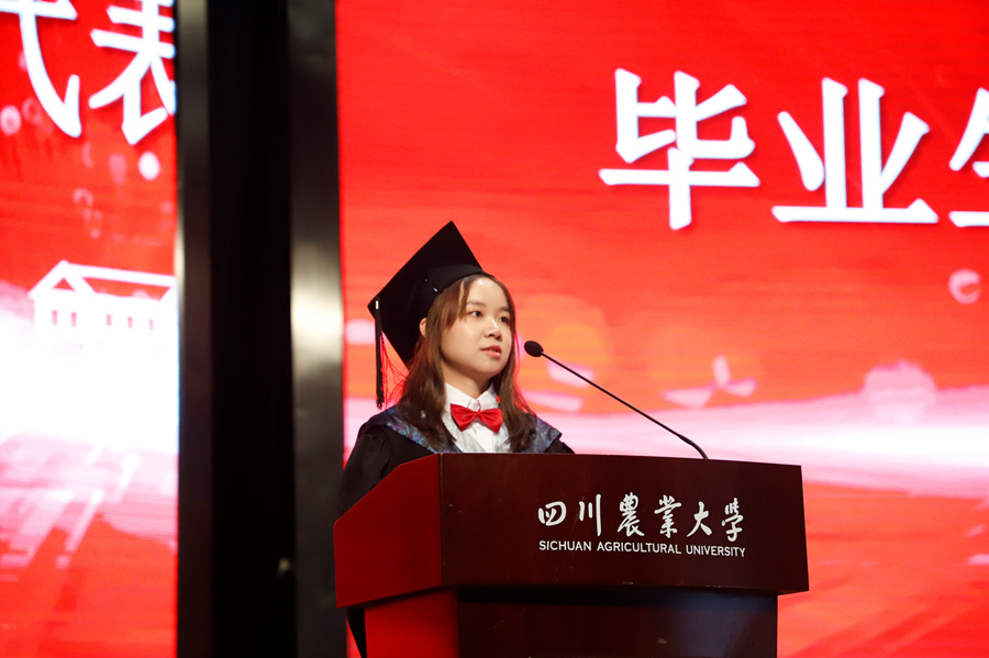 毕业生代表钟若希对全体老师表达了诚挚的谢意,分享了疫情期间留校学习备战保研,最终选择留在学院攻读区域经济学硕士研究生的成长故事,她以“追求真理、造福社会、自强不息”的校训和“厚德博学、经世济民”的院训,祝福同学们带着川农人、经济学人的自信和勇敢,迎接未来生活中的种种挑战。