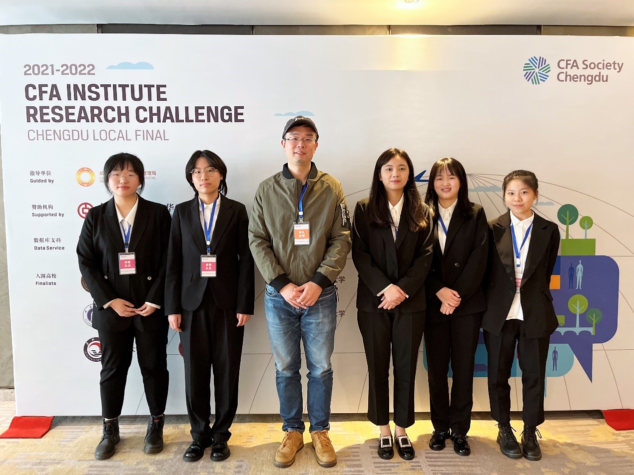 12月5日,由CFA成都协会主办的2021-2022赛季“CFA全球投资分析大赛(CFA Institute Research Challenge)”中国中西部赛区决赛在成都希尔顿酒店顺利举行。来自西南财经大学、西南大学、贵州大学等多所高校的28支队伍参与中国中西部赛区半决赛,我校代表队成功闯入决赛并在决赛中斩获三等奖(第三名)。这也是我院投资、金融本科学子近三年来第二次取得CFA全球投资分析大赛地区赛前三名的成绩,充分体现了学院持续加强本科专业建设的显著成效。