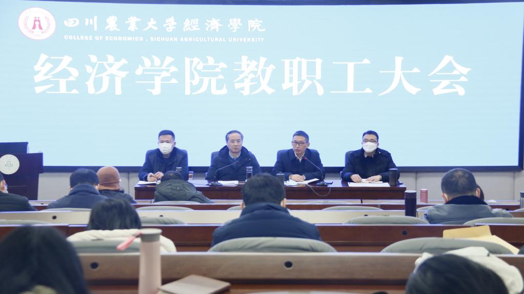 蒋远胜总结了过去一年学院在党的建设、一流专业建设、学科和研究生工作、科学研究方面取得的主要成绩,指出了在高层次人才引进、重大重点项目立项和高质量论文发表、研究生科研产出、本科生高级别竞赛获奖等方面还存在的差距。他提出2022年学院工作的总体要求是落实立德树人根本任务,以新文科、新财经建设为引领,加快推进国家、省级一流本科专业和课程建设,加强应用经济学和金融专硕点的分类建设,狠抓对外合作和横向项目,多渠道增加学院基金收入,不断壮大教学科研队伍和完善制度建设。