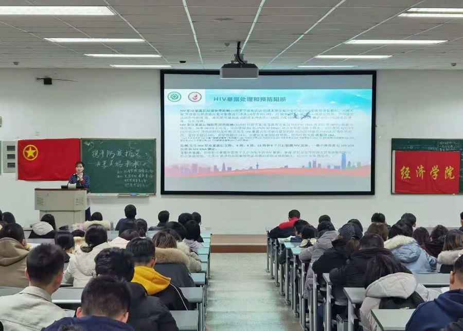 今年世界艾滋病日的宣传主题是“携手防疫抗艾,共担健康责任”。在活动现场,医护人员通过幻灯片讲解、发放宣传材料和现场答疑等形式,向同学们详细介绍了艾滋病的基本知识、传播途径、感染原因以及预防措施。“只有我们整个社会都消除对艾滋病人的歧视,我们才能够彻底地治愈艾滋病以及它造成的社会创伤。”刘淼医师动容地讲述自身对于艾滋病以及患病群体的理解。最后,王吉丽医师告诫同学们要洁身自爱,注意安全卫生,同时呼吁同学们把艾滋病预防知识普及到学校和社会,培养人人都能有效预防艾滋病的意识。