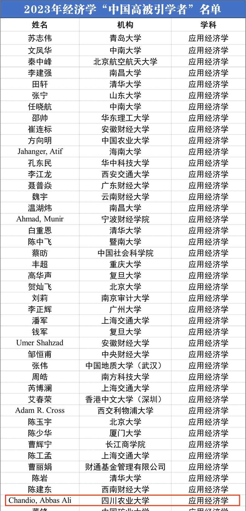 Associate Professor Abbas Ali Chandio's inclusion not only affirms his personal academic achievements but also reflects the remarkable achievements of the school in promoting the construction of the discipline of applied economics through research team building and internationalization of the faculty. The school will continue to integrate education, technology, and talent work, attract high-quality faculty to engage in high-level research, cultivate high-quality talents, continuously improve the academic level and influence of the school, and achieve high-quality development. At the same time, the school will also strengthen exchanges and cooperation with well-known universities and research institutions at home and abroad, promote the internationalization of economic research, and make positive contributions to the cultivation of more outstanding talents with international perspectives and innovative abilities.